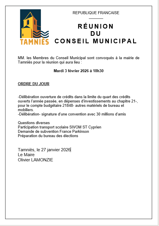Mmes et MM les conseillers municipaux sont  invités à assister à la réunion du conseil municipal en date du 03 février 2026