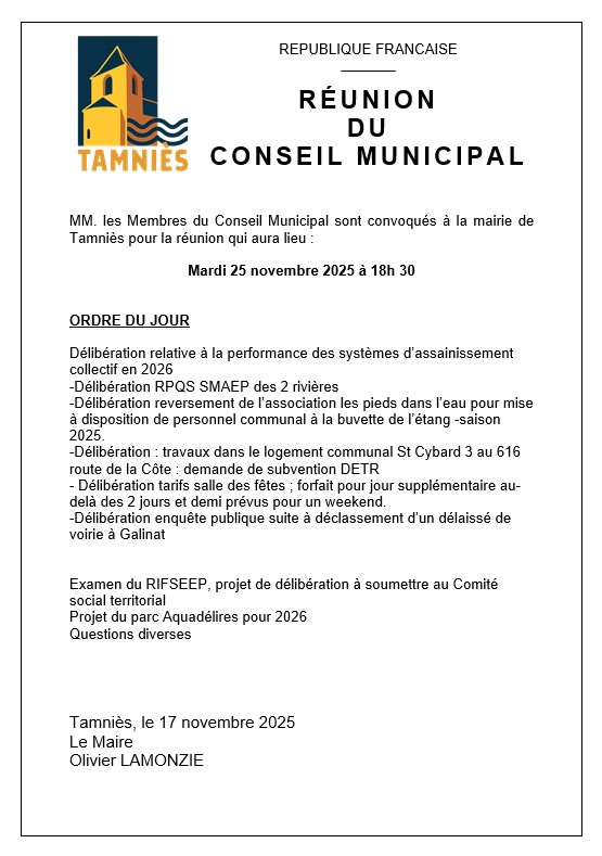 Mmes et MM les conseillers municipaux sont  invités à assister à la réunion du conseil municipal en date du 25 novembre 2025