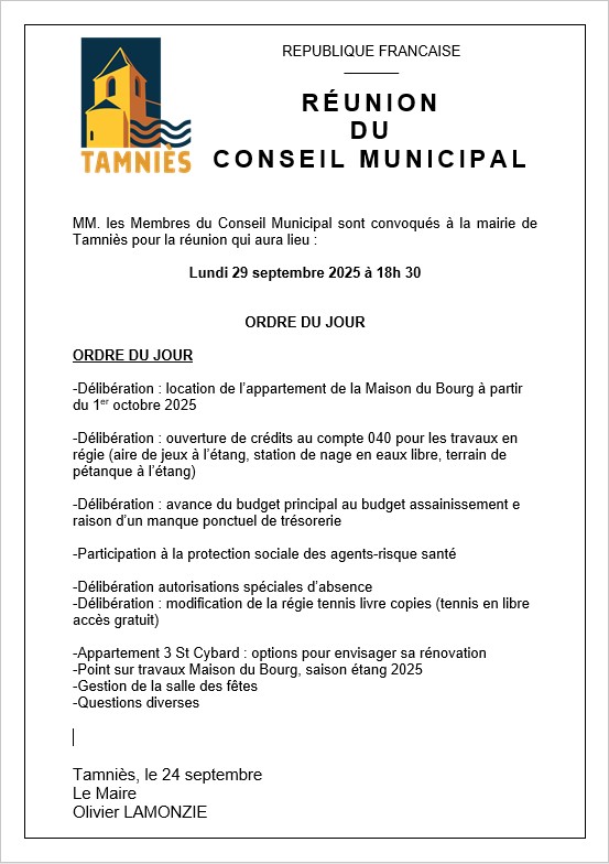 Mmes et MM les conseillers municipaux sont  invités à assister à la réunion du conseil municipal en date du 29 septembre 2025